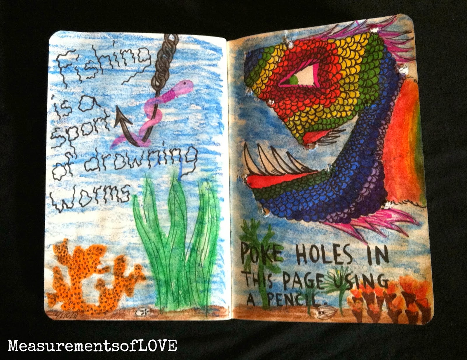 For this page I was suppose to Poke Holes in this Page using a Pencil. So, I poked some holes where the page indicated to with a pencil. Then I thought, I can't leave it like that. I just started connecting the dots of the holes and somehow it looked like a fish. I just went with it and drew the rest of the underwater scene.